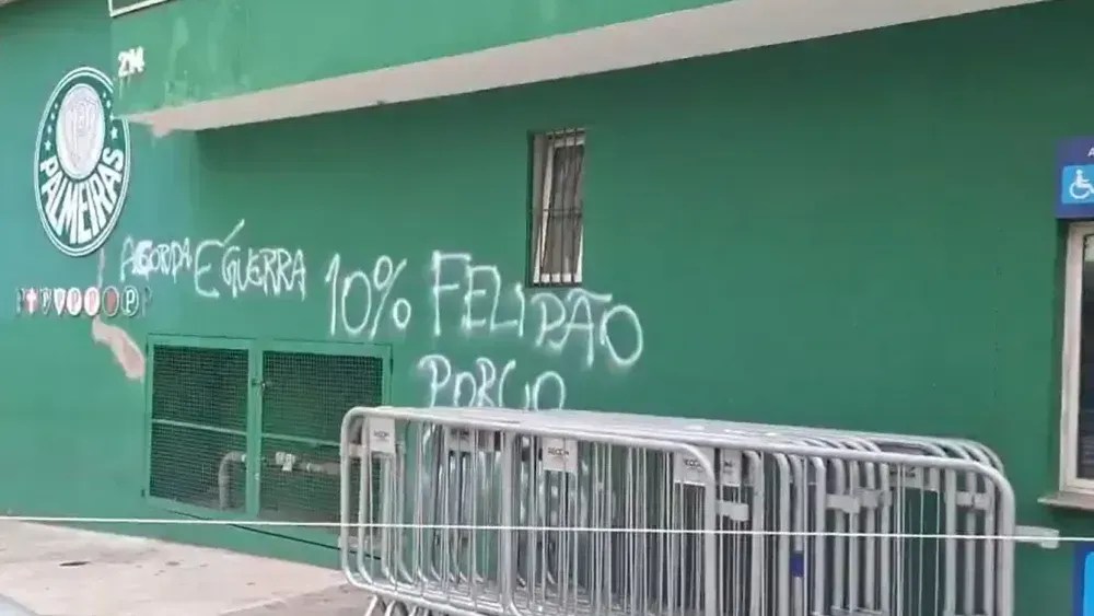 Muros da sede do Palmeiras e da bilheteria do Allianz Parque amanheceram pichados com protestos após a derrota para o Corinthians, no último domingo (16), pela ...