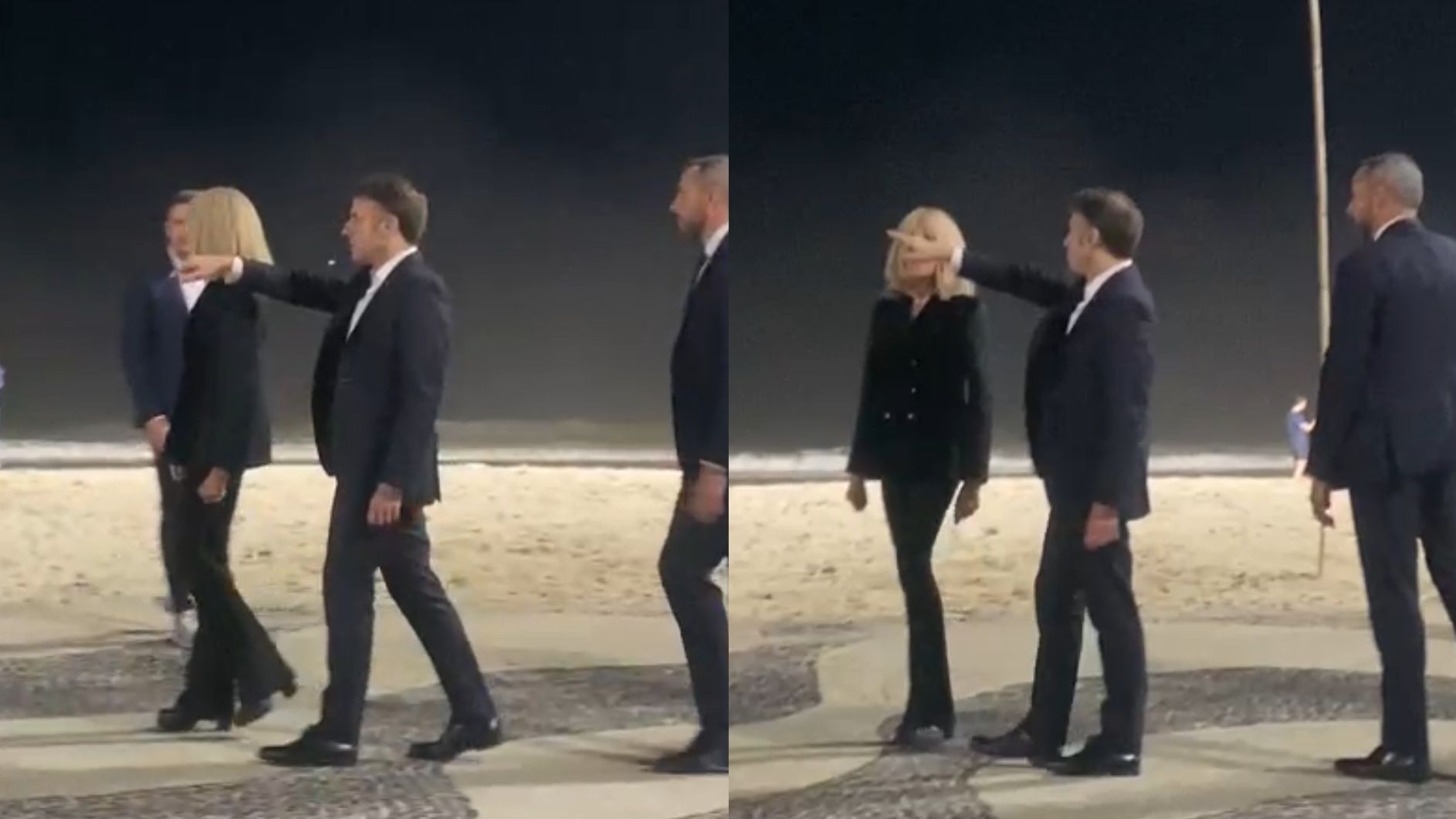 O presidente da França, Emmanuel Macron, foi visto caminhando pela orla da Praia de Copacabana, na zona sul do Rio de Janeiro, na noite deste domingo (17).